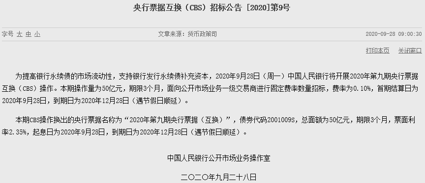 中國人民銀行:為提高銀行永續(xù)債的市場(chǎng)流動(dòng)性,支持銀行發(fā)行永續(xù)債補(bǔ)充資本,2020年9月28日(周一)中國人民銀行將開展2020年第九期央行票據(jù)互換(CBS)操作。本期操作量為50億元,期限3個(gè)月,面向公開市場(chǎng)業(yè)務(wù)一級(jí)交易商進(jìn)行固定費(fèi)率數(shù)量招標(biāo),費(fèi)率為0.10%。