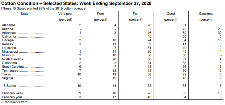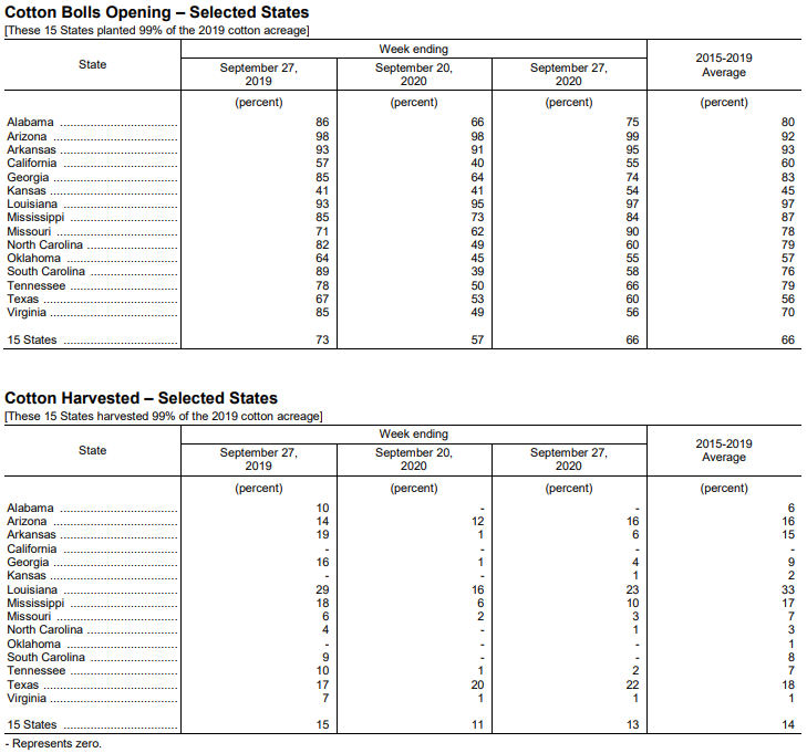 美國農(nóng)業(yè)部9月28日發(fā)布的美國棉花生產(chǎn)報告顯示,截至9月27日當(dāng)周,美棉吐絮進(jìn)度為66%,前周為57%,去年同期為73%,5年均值為66%。美棉收獲進(jìn)度為13%,前周為11%,去年同期為15%,5年均值為14%。美棉優(yōu)良率為43%,前周為45%,去年同期為40%。