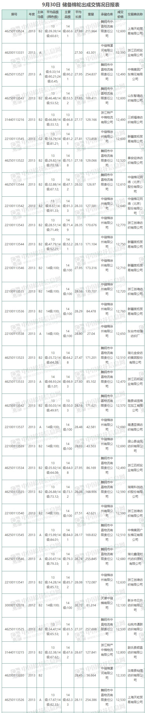 9月30日儲(chǔ)備棉輪出銷售資源4310.846噸,實(shí)際成交4310.846噸,成交率100%,成交均價(jià)12591元/噸,較29日上漲294元/噸,折3128價(jià)格13930元/噸,較29日下跌128元/噸。