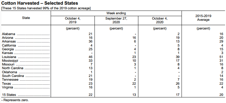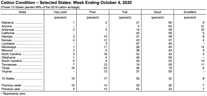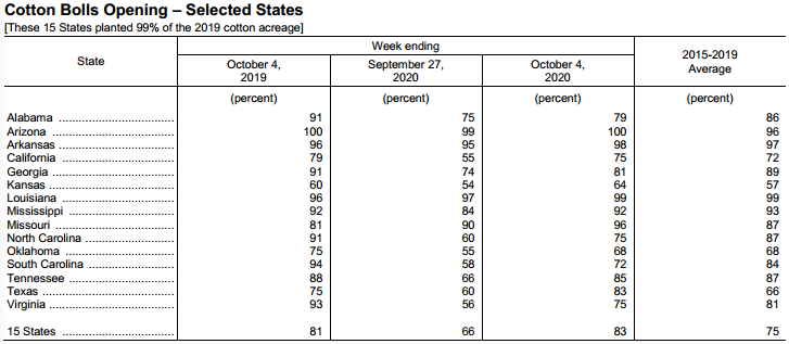 美國(guó)農(nóng)業(yè)部10月5日發(fā)布的美國(guó)棉花生產(chǎn)報(bào)告顯示,截至10月4日當(dāng)周,美棉吐絮進(jìn)度為83%,前周為66%,去年同期為81%,5年均值為75%。美棉收獲進(jìn)度為17%,前周為13%,去年同期為22%,5年均值為20%。美棉優(yōu)良率為40%,前周為43%,去年同期為39%。