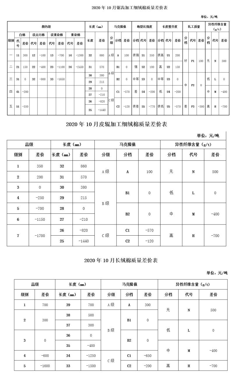 9月進(jìn)入棉花收獲季,全國各大棉區(qū)陸續(xù)開展新年度的棉花收購、加工工作,在對新年度棉花質(zhì)量產(chǎn)量形勢、實(shí)際貿(mào)易中的定級定價(jià)與質(zhì)量差價(jià)表的執(zhí)行等情況進(jìn)行廣泛市場調(diào)查的基礎(chǔ)上,參照生產(chǎn)、加工、質(zhì)檢、流通、紡織等各環(huán)節(jié)業(yè)內(nèi)專家的意見,現(xiàn)對2020年10月《鋸齒加工細(xì)絨棉質(zhì)量差價(jià)表》做出如下調(diào)整(單位:元/噸):