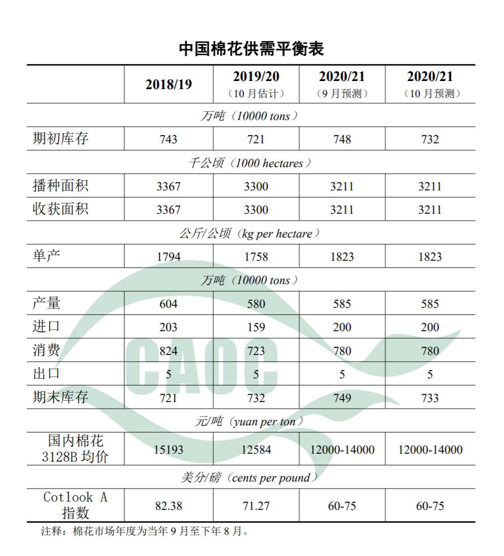 2019/20棉花市場年度結(jié)束,棉花進口159萬噸,期末庫存估計732萬噸,均調(diào)減16萬噸;國內(nèi)3128B級棉花均價每噸12584元,CotlookA指數(shù)均價每磅71.27美分,均處預測區(qū)間。9月新疆大部棉區(qū)光溫條件較好,北疆手采和機采時間提早,交售價格回升。長江中下游9月以來部分地區(qū)陰雨天氣導致爛鈴多發(fā),對棉花單產(chǎn)和品質(zhì)的影響有待進一步跟蹤評估。2020/21年度棉花生產(chǎn)、消費和貿(mào)易均維持上月預測不變,期末庫存調(diào)減16萬噸至733萬噸。
