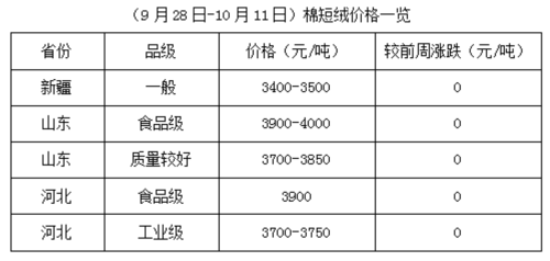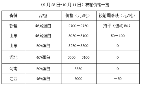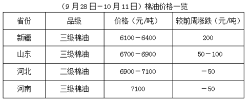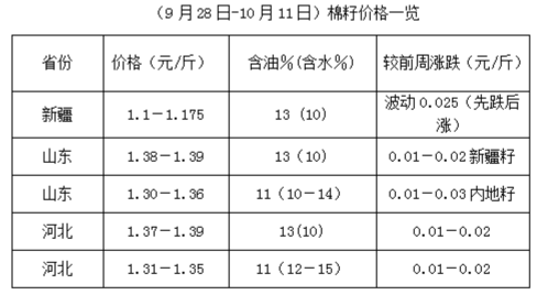 9月28日-10月11日,受國慶長假影響,市場波動難穩(wěn),國內(nèi)期貨停盤,現(xiàn)貨市場失去指引,導(dǎo)致棉市整體報價走弱,節(jié)后期貨大豆及豆類產(chǎn)品大漲,推動棉油、棉粕行情,部分地區(qū)由弱轉(zhuǎn)強,棉籽先跌后漲,油棉廠開工率進一步提升,市場由假期間的混亂逐步納入正軌。