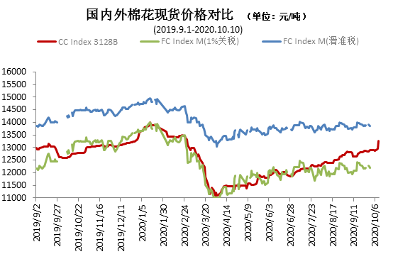 9月,儲(chǔ)備棉輪出結(jié)束,本月全部成交,紡織行業(yè)進(jìn)入傳統(tǒng)旺季,企業(yè)信心有所提升,月中下旬開機(jī)率和訂單都有所增加,棉紗等價(jià)格小幅上漲,棉花采購(gòu)量和需求大幅增加,國(guó)內(nèi)棉花現(xiàn)貨繼續(xù)上漲并高于國(guó)際棉價(jià)。同期,國(guó)際期現(xiàn)貨棉價(jià)緩慢上升,漲幅低于國(guó)內(nèi)棉花現(xiàn)貨,1%關(guān)稅下外棉現(xiàn)貨價(jià)格仍低于國(guó)內(nèi)棉花現(xiàn)貨價(jià)格。