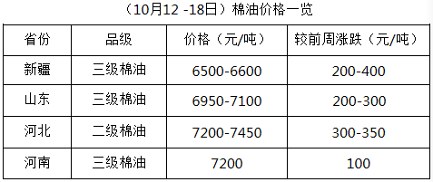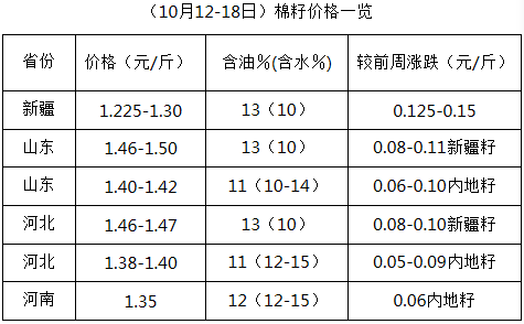上周(10月12-18日),鄭棉期貨價格節(jié)節(jié)攀升,漲勢如潮,各地軋花廠積極提價收購籽棉,皮棉報價也不斷上漲,打開了籽棉收購新局面。受棉籽價格大漲推動,棉油、棉粕報價上漲,呈現(xiàn)偏強運行局面。油棉廠盈利不佳,經(jīng)營困難不減,市場仍處進一步調(diào)整中。