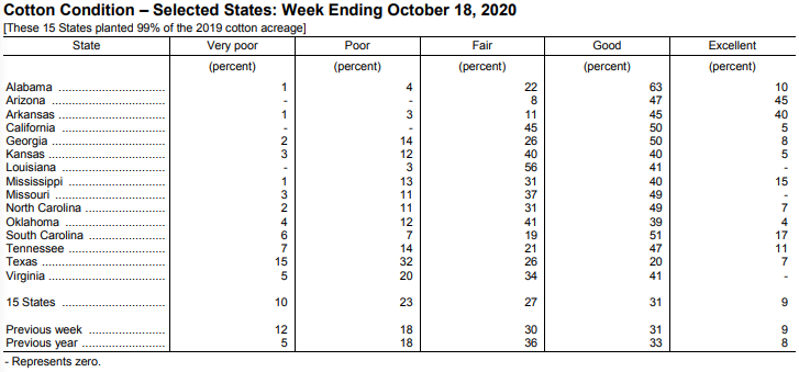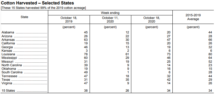 美國農(nóng)業(yè)部10月19日發(fā)布的美國棉花生產(chǎn)報告顯示,截至10月18日當周,美棉吐絮進度為93%,前周為90%,去年同期為91%,5年均值為89%。美棉收獲進度為34%,前周為26%,去年同期為38%,5年均值為34%。美棉優(yōu)良率為40%,前周為40%,去年同期為41%,差苗比例為33%,較前周增加3個百分點。