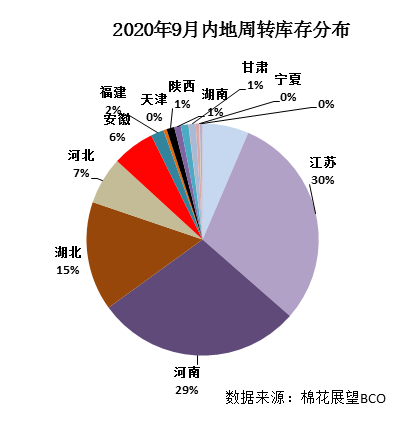 9月紡織市場(chǎng)繼續(xù)回暖,儲(chǔ)備棉輪出企業(yè)競(jìng)拍積極,棉花需求增加,盡管有部分新棉加工入庫(kù),月末國(guó)內(nèi)棉花周轉(zhuǎn)庫(kù)存仍下降,繼續(xù)低于去年同期。據(jù)中國(guó)棉花協(xié)會(huì)棉花物流分會(huì)對(duì)全國(guó)棉花交易市場(chǎng)18個(gè)省市的154家棉花交割和監(jiān)管倉(cāng)庫(kù)的調(diào)查數(shù)據(jù)顯示,9月底全國(guó)棉花周轉(zhuǎn)庫(kù)存總量約134.9萬(wàn)噸,低于去年同期36.42萬(wàn)噸;較上月下降30.06萬(wàn)噸,降幅18.22%。