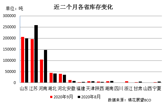 分省份看,山東省庫(kù)存量保持首位,為20.54萬(wàn)噸,江蘇省次之為19.56萬(wàn)噸,河南省居第三位為10.40萬(wàn)噸,湖北省為4.52萬(wàn)噸,河北省為4.03萬(wàn)噸,安徽省為1.24萬(wàn)噸,其他省在萬(wàn)噸以下。