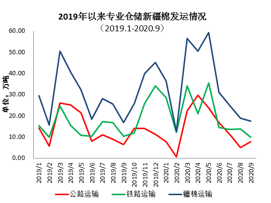 2020年(2020年1月-2020年9月)出疆棉公路與鐵路共發(fā)運(yùn)307.39萬(wàn)噸,同比增加50.61萬(wàn)噸。