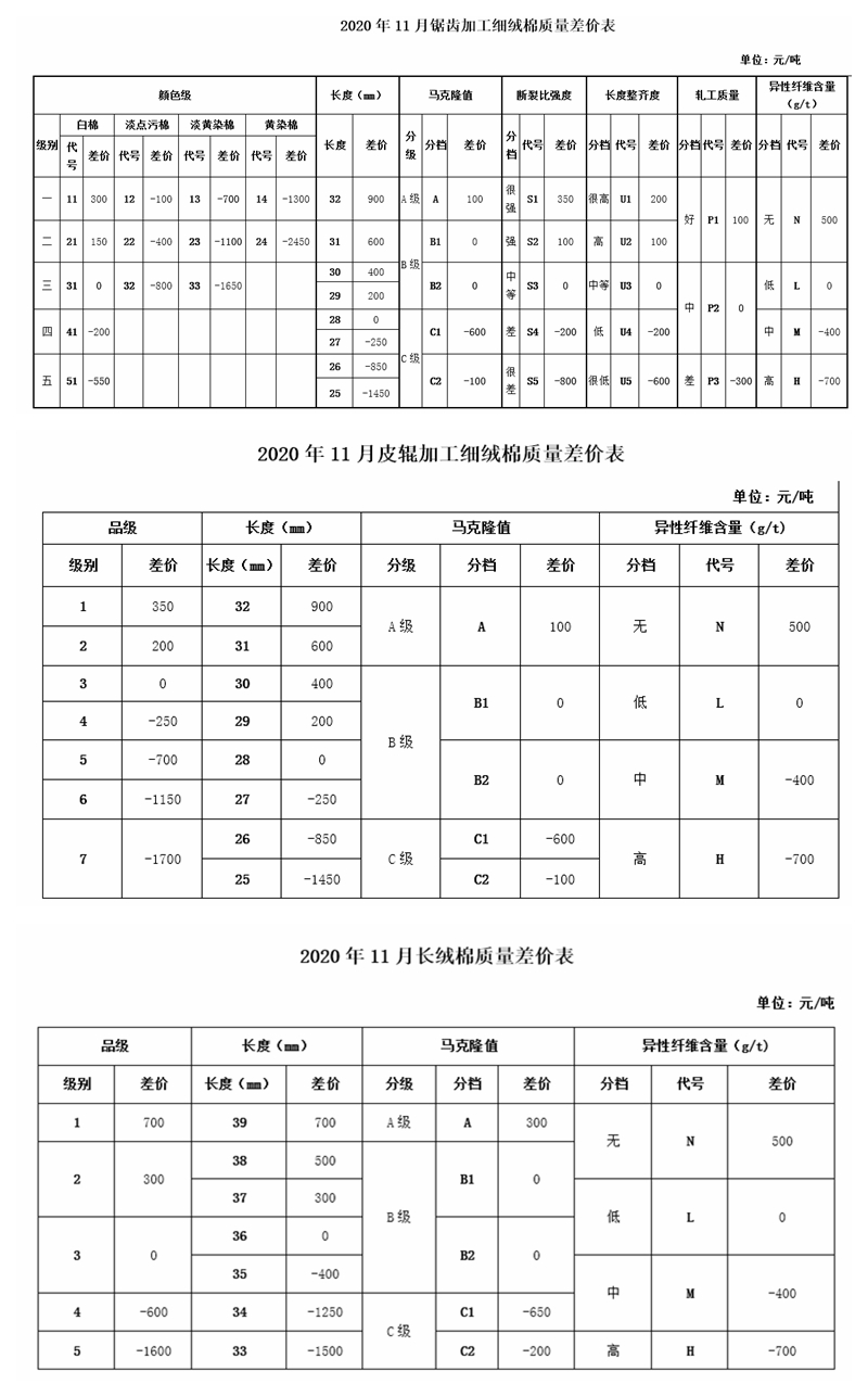 依據(jù)2020年10月的棉花公檢質(zhì)量數(shù)據(jù)、中國棉花協(xié)會(huì)棉花質(zhì)量?jī)r(jià)差自動(dòng)生成系統(tǒng)采集的棉花加工企業(yè)銷售成交價(jià)、紡織企業(yè)監(jiān)測(cè)點(diǎn)的采集數(shù)據(jù)以及當(dāng)月的中國棉花價(jià)格指數(shù),2020年11月鋸齒加工細(xì)絨棉質(zhì)量差價(jià)調(diào)整數(shù)據(jù)據(jù)此生成,并征求業(yè)內(nèi)相關(guān)專家的意見,現(xiàn)做出如下調(diào)整(單位:元/噸):