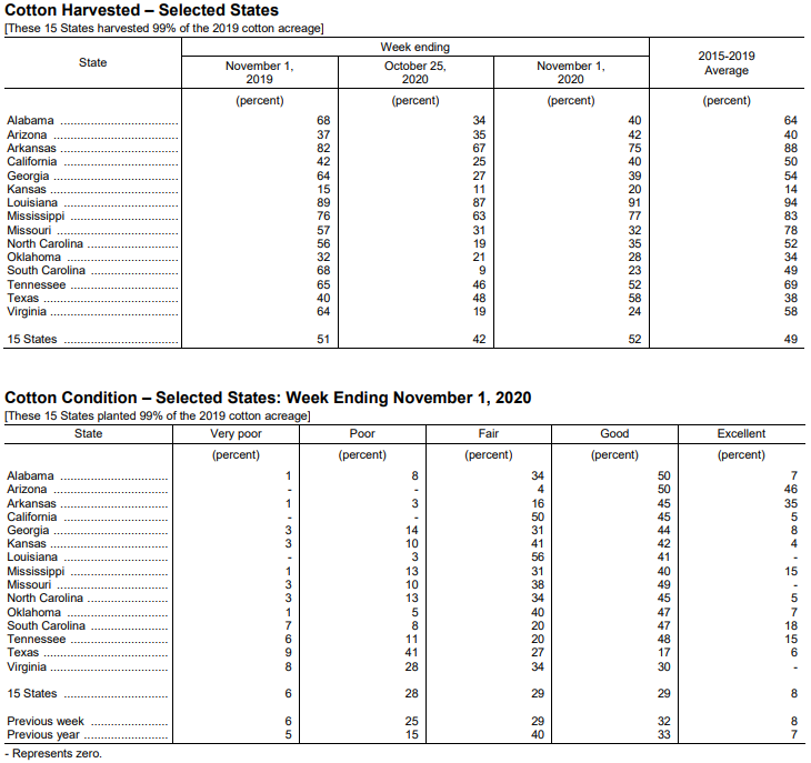 美國農(nóng)業(yè)部11月2日發(fā)布的美國棉花生產(chǎn)報(bào)告顯示,截至11月1日當(dāng)周,美棉收獲進(jìn)度為52%,前周為42%,去年同期為51%,5年均值為49%。美棉優(yōu)良率為37%,前周為40%,去年同期為40%,差苗比例為34%,較前周增加3個(gè)百分點(diǎn)。
