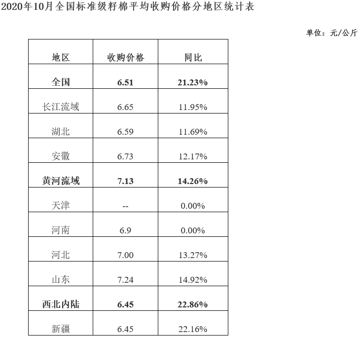 據(jù)統(tǒng)計(jì),截止到10月31日全國400型棉花加工企業(yè)3128級籽棉平均收購價6.51元/公斤,環(huán)比上漲3.99%,同比上漲21.23%。新疆籽棉收購價6.45元/公斤,環(huán)比上漲3.20%,同比上漲22.16%;長江流域籽棉收購價6.65元/公斤,環(huán)比上漲9.02%,同比上漲11.95%;黃河流域收購價7.13元/公斤,環(huán)比上漲9.86%,同比上漲14.26%。