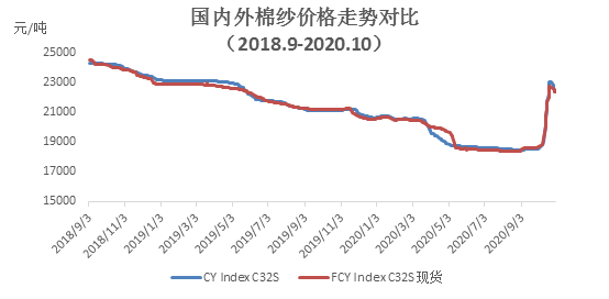本月內(nèi)外棉紗價(jià)格大幅上漲。國(guó)產(chǎn)32支純棉紗10月均價(jià)21668元/噸,較上月上升3156元/噸,較去年同期上漲556元/噸,漲幅2.63%;進(jìn)口32支純棉紗月均價(jià)21601元/噸,較上月上升3006元/噸,較去年同期上漲409元/噸,漲幅1.93%。