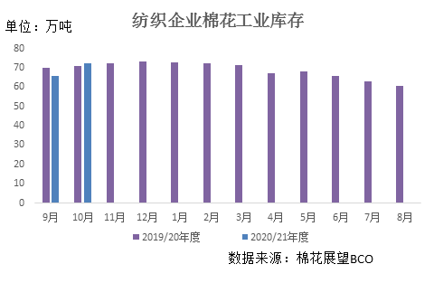 本月,下游市場(chǎng)需求出現(xiàn)好轉(zhuǎn),紡織企業(yè)原料在低庫(kù)存下逐漸開(kāi)始補(bǔ)庫(kù),但新花上市后價(jià)格上漲幅度高,企業(yè)補(bǔ)庫(kù)較為慎重。截至10月30日,紡織企業(yè)在庫(kù)棉花工業(yè)庫(kù)存量72.12噸,較上月底上升6.26萬(wàn)噸,同比增加1.16萬(wàn)噸。其中18%企業(yè)減少棉花庫(kù)存,51%增加庫(kù)存,31%基本保持不變。