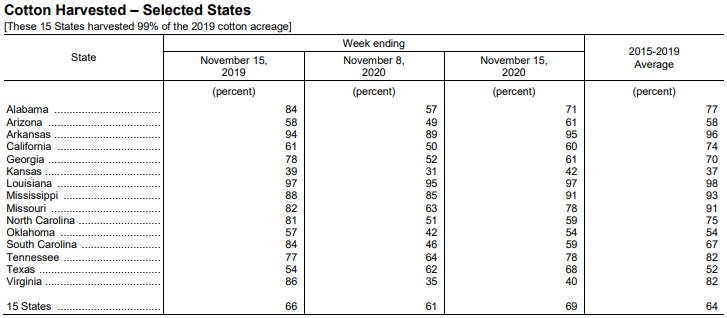 美國(guó)農(nóng)業(yè)部11月16日發(fā)布的美國(guó)棉花生產(chǎn)報(bào)告顯示,截至11月15日當(dāng)周,美棉收獲進(jìn)度為69%,前周為61%,去年同期為66%,5年均值為64%。
