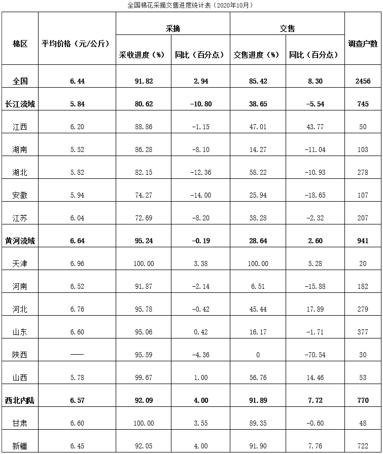 10月,中國棉花協(xié)會對全國13個(gè)省市及新疆生產(chǎn)建設(shè)兵團(tuán)2456個(gè)定點(diǎn)農(nóng)戶進(jìn)行棉花單產(chǎn)及采摘交售情況的調(diào)查。調(diào)查結(jié)果顯示:新疆采收和交售均快于去年,月底北疆地區(qū)棉花采收接近結(jié)束,南疆地區(qū)進(jìn)入高峰期。內(nèi)地大部地區(qū)棉花停止生長,黃河流域棉區(qū)采摘進(jìn)度與去年持平;長江流域棉區(qū)采摘進(jìn)度慢于去年同期。上中旬,籽棉交售價(jià)跟隨皮棉期現(xiàn)貨市場快速上漲,下旬有所回落,但仍較大幅度高于去年。截至10月底,全國采摘進(jìn)度為91.82%,同比快2.94個(gè)百分點(diǎn);交售進(jìn)度為85.42%,同比快8.30個(gè)百分點(diǎn);平均交售價(jià)6.44元/公斤,同比上漲27.52%。