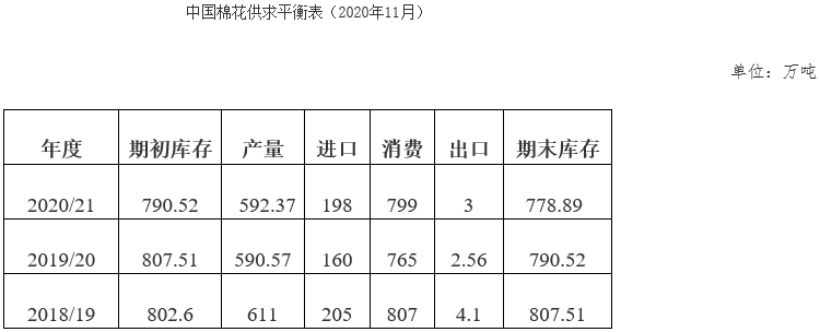 10月,全國棉花進(jìn)入采摘高峰期,進(jìn)度快于去年,籽棉收購價上漲幅度較大。紡織市場處傳統(tǒng)旺季,企業(yè)訂單充裕,原料需求增加,國內(nèi)外棉價繼續(xù)上漲,外棉漲幅低于國內(nèi),內(nèi)外棉價差擴(kuò)大。新棉集中上市,商業(yè)庫存大幅增加。儲備棉輪入政策發(fā)布,輪入總量50萬噸左右。據(jù)中國棉花協(xié)會預(yù)測,2020年度全國棉花總產(chǎn)量592.37萬噸,同比增長0.3%,長江流域受陰雨天氣影響較上期下調(diào)0.78萬噸,其他地區(qū)保持不變;由于2019年度棉花出口較上期下調(diào)0.44萬噸,2020年度期初庫存較上期上調(diào)0.44萬噸,期末庫存較上期下調(diào)0.39萬噸。