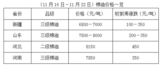 上周(11月16-22日),大豆期貨及各種豆類產(chǎn)品高位震蕩調(diào)整,整體表現(xiàn)粕弱油強(qiáng),棉油持續(xù)跟漲,且漲幅擴(kuò)大,刷新歷史新高,棉粕持續(xù)下跌,棉副產(chǎn)品支撐力度不足,油棉廠加工虧損持續(xù),降價收購棉籽,加之內(nèi)地部分地區(qū)環(huán)保嚴(yán)查,油棉廠借此停機(jī)休整,市場開工率有所下降。