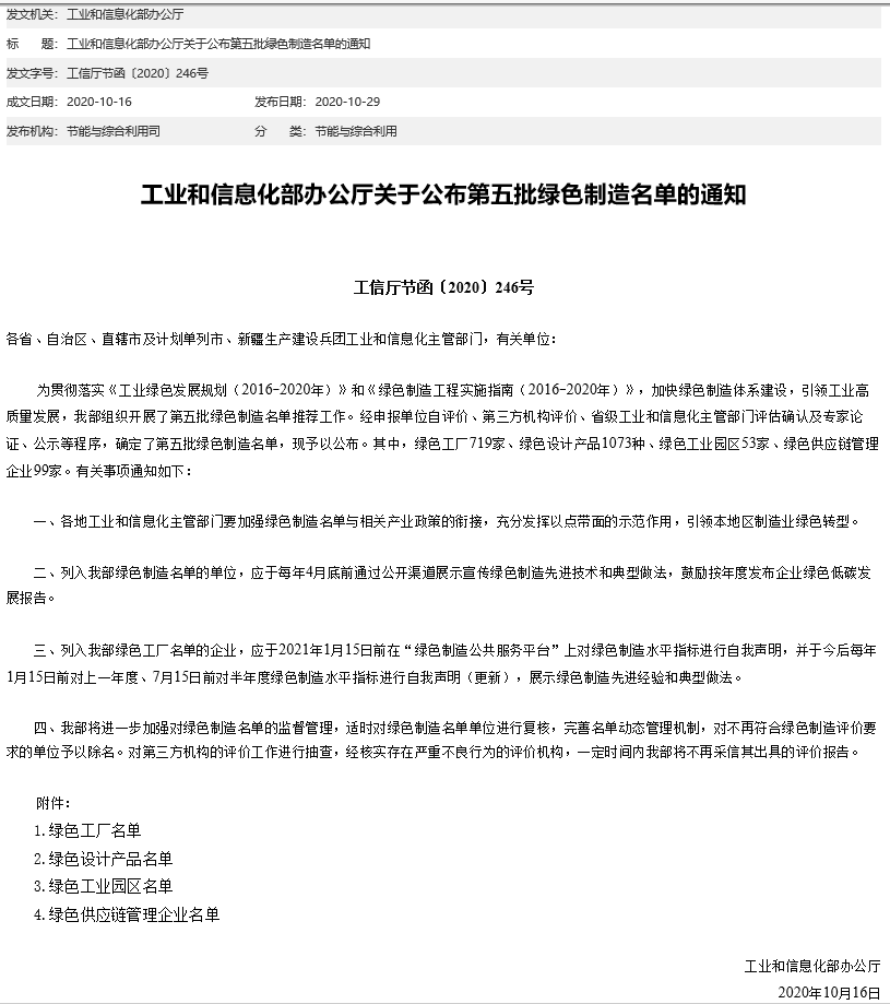 為貫徹落實《工業(yè)綠色發(fā)展規(guī)劃(2016-2020年)》和《綠色制造工程實施指南(2016-2020年)》,加快綠色制造體系建設,引領工業(yè)高質量發(fā)展,我部組織開展第五批綠色制造名單推薦工作。經申報單位自評價、第三方機構評價、省級工業(yè)和信息化主管部門評估確認及專家論證、公示等程序,確定第五批綠色制造名單,現(xiàn)予以公布。其中綠色工廠719家、綠色設計產品1073種、綠色工業(yè)園區(qū)53家、綠色供應鏈管理企業(yè)99家。