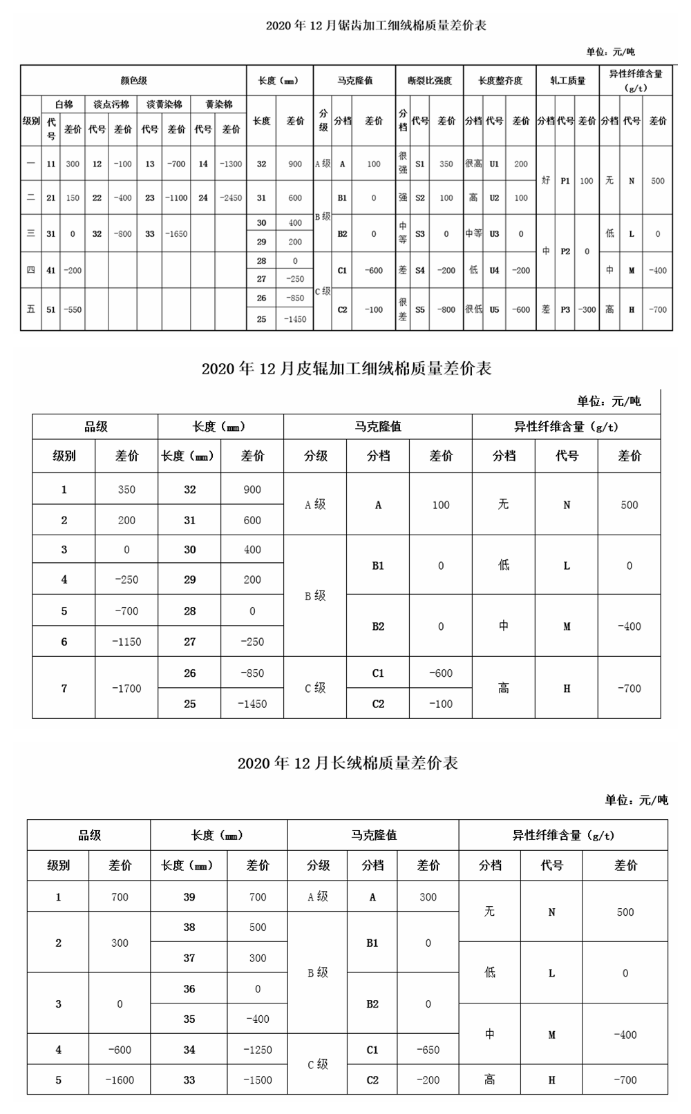 根據(jù)《中國(guó)棉花協(xié)會(huì)國(guó)產(chǎn)棉質(zhì)量差價(jià)表管理辦法》規(guī)定,現(xiàn)正式發(fā)布2020年12月《鋸齒加工細(xì)絨棉質(zhì)量差價(jià)表》、《皮輥加工細(xì)絨棉質(zhì)量差價(jià)表》和《長(zhǎng)絨棉質(zhì)量差價(jià)表》(單位:元/噸)。
