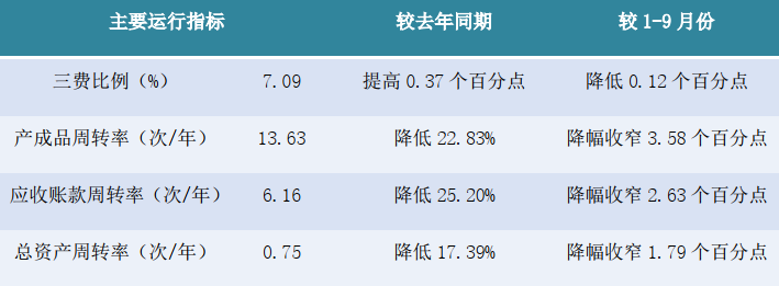 據(jù)國(guó)家統(tǒng)計(jì)局?jǐn)?shù)據(jù),1-10月規(guī)模以上印染企業(yè)三費(fèi)比例7.09%,同比提高0.37個(gè)百分點(diǎn),其中棉印染企業(yè)為6.83%,化纖印染企業(yè)為9.00%。產(chǎn)成品周轉(zhuǎn)率13.63次/年,同比降低22.83%;應(yīng)收賬款周轉(zhuǎn)率6.16次/年,同比降低25.20%;總資產(chǎn)周轉(zhuǎn)率0.75次/年,同比降低17.39%。與前3季度相比,1-10月企業(yè)三費(fèi)比例降低0.12個(gè)百分點(diǎn),產(chǎn)成品周轉(zhuǎn)率降幅收窄3.58個(gè)百分點(diǎn),應(yīng)收賬款周轉(zhuǎn)率降幅收窄2.63個(gè)百分點(diǎn),總資產(chǎn)周轉(zhuǎn)率降幅收窄1.79個(gè)百分點(diǎn)。