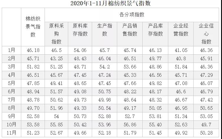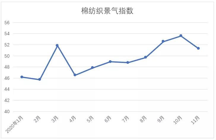 說明:中國棉紡織行業(yè)景氣指數(shù)采集自全國近500家次棉紡織企業(yè),參考國家制造業(yè)PMI等指數(shù)制定方式,通過對多個(gè)主要指標(biāo)加權(quán)計(jì)算得出,當(dāng)指數(shù)高于50,表示棉紡織行業(yè)本月景氣程度好于上月,低于50則表示本月景氣程度不及上月。