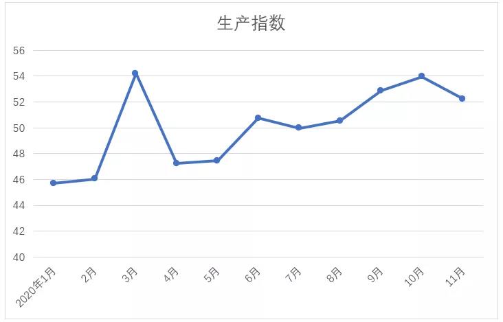 11月,原料采購指數(shù)為52.67。本月,國內(nèi)棉花期現(xiàn)貨價(jià)格呈區(qū)間震蕩,國外棉價(jià)沖高回落。本月,國內(nèi)新棉加工量大幅上升,市場棉花資源充裕在一定程度上抑制棉價(jià)上漲,棉價(jià)上漲幅度低于上月。外棉方面,受新冠肺炎疫苗利好消息及美國大選等因素的刺激,11月中旬國際棉價(jià)震蕩走高,隨后由于缺乏需求支撐,棉價(jià)有所回落?;w短纖方面,直紡滌短整體交投情緒略淡,價(jià)格有所下跌;粘膠纖維價(jià)格上漲。