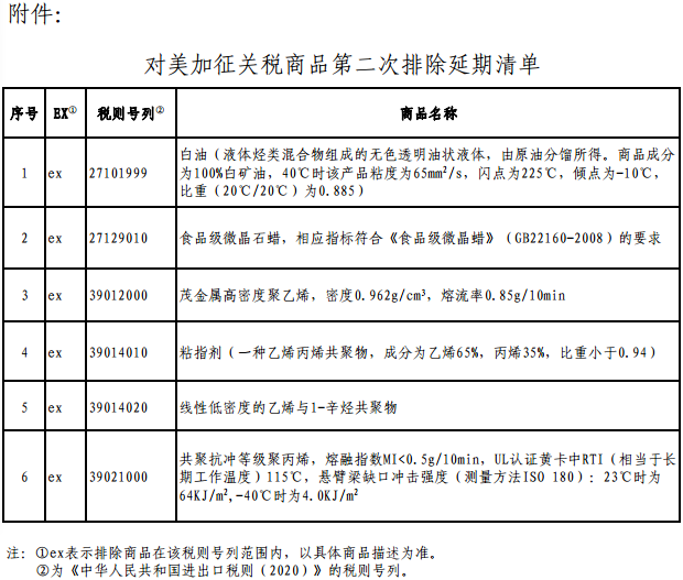 對附件所列6項商品,稅委會公告〔2019〕8號規(guī)定的排除期限延長一年,即自2020年12月26日至2021年12月25日,繼續(xù)不加征我為反制美301措施所加征的關(guān)稅。