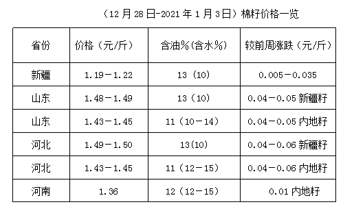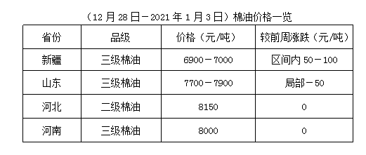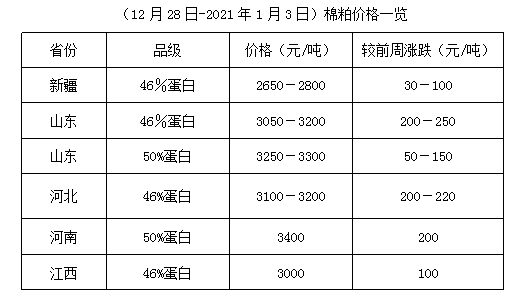 上周(2020年12月28日-2021年1月3日),隨著元旦假期的到來(lái),市場(chǎng)在年末時(shí)段表現(xiàn)良好,豆粕期貨周四(12月31日)大幅上漲,刷新歷史高位,豆油高位震蕩調(diào)整,利多棉油、棉粕行情,山東冬季環(huán)保預(yù)警解除,油棉廠陸續(xù)開(kāi)始收購(gòu)開(kāi)工,棉副產(chǎn)品貨少持價(jià)為主,但因元旦假期到來(lái),市場(chǎng)整體成交少量。