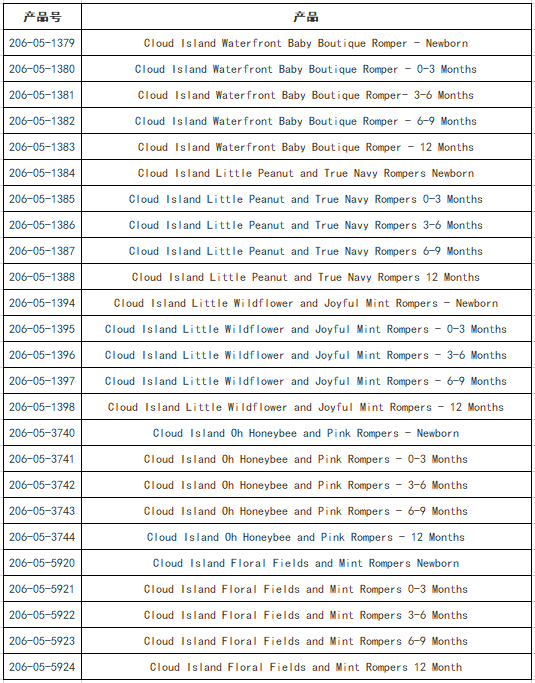 此次召回產(chǎn)品為CloudIsland的多款嬰兒連體衣。白色標(biāo)簽上印有產(chǎn)品號(hào),具體召回產(chǎn)品信息如下:
