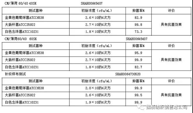 采用粘膠基薄荷纖維,含薄荷抗菌萃取物,薄荷纖維與棉纖維混紡紗線,具有抗菌防臭功能,對大腸桿菌,金黃色葡萄球菌和白色念珠菌都具有抵抗和抑制作用,檢測結(jié)果如下: