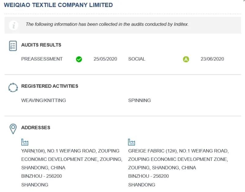 魏橋紡織5月通過預審,6月通過正式審核。至此魏橋創(chuàng)業(yè)集團旗下魏橋紡織股份有限公司、魏聯(lián)印染、嘉嘉家紡都已通過驗廠,且都是A級,可以成為Inditex旗下所有品牌的供應(yīng)商。