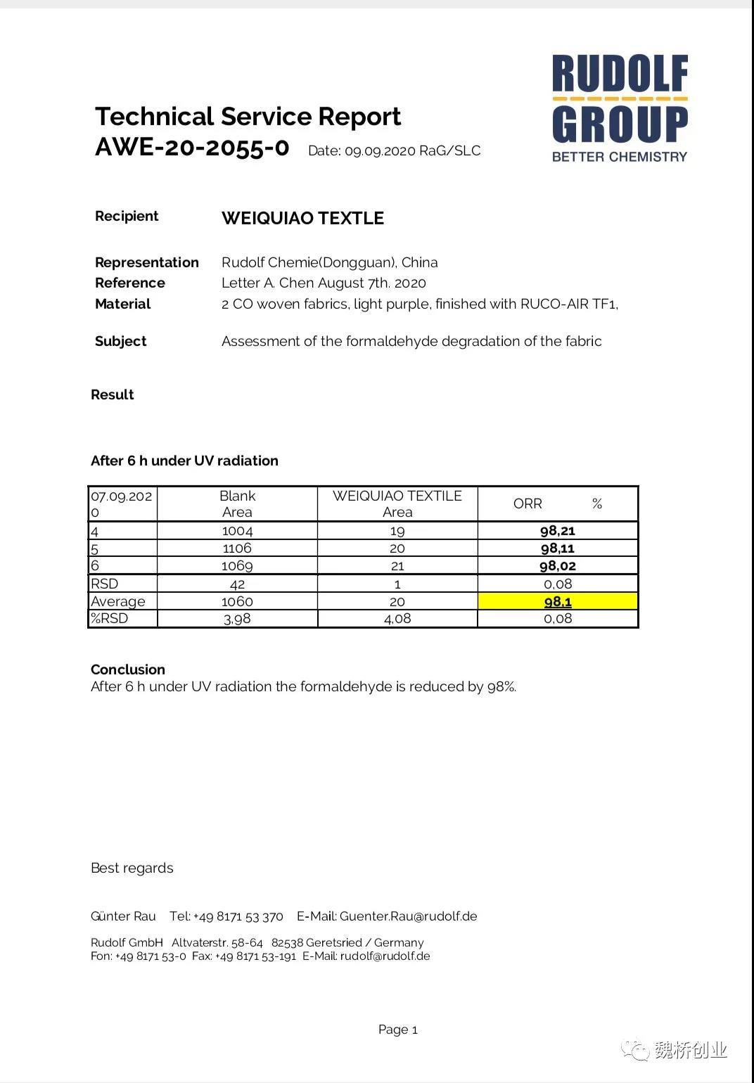 此款空氣凈化整理面料采用魯?shù)婪騌UCO—AIRTF1整理劑,該整理劑是基于無機(jī)鹽的高效光觸媒產(chǎn)品,通過日光照射改善室內(nèi)空氣質(zhì)量,因為催化效果不會消失,可持續(xù)整個產(chǎn)品的生命周期,含有永不耗竭的耐洗活性物質(zhì),所以對空氣的凈化是永久的。而且該整理劑操作簡便,對人體無害,且與其它整理劑兼容性好。經(jīng)處理后的面料手感柔軟,光澤亮麗且具有良好的空氣凈化效果。此款面料具有非常廣泛的用途,可用于起居室、酒店、健康護(hù)理中心、療養(yǎng)中心、工廠、辦公室、政府部門、公交系統(tǒng)等。經(jīng)德國魯?shù)婪驅(qū)嶒炇覚z測,該面料對甲醛的去除率可達(dá)98%,效果顯著。