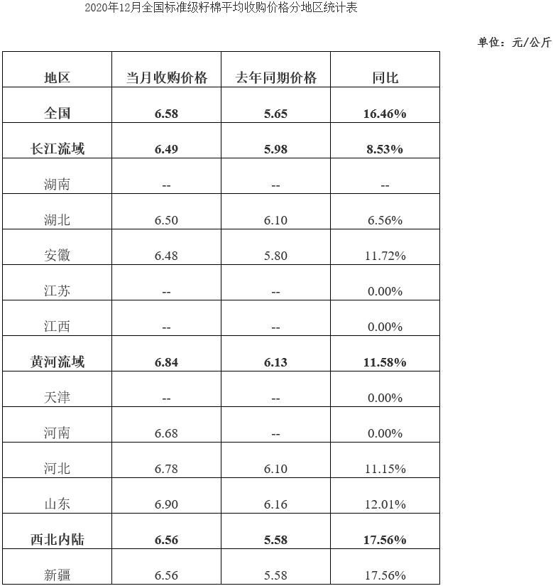據(jù)統(tǒng)計,截止到12月31日,全國400型棉花加工企業(yè)3128級籽棉平均收購價6.58元/公斤,同比上漲16.46%。新疆籽棉收購價6.56元/公斤,同比上漲17.56%;長江流域收購價6.49元/公斤,同比上漲8.53%;黃河流域收購價6.84元/公斤,同比上漲11.58%。