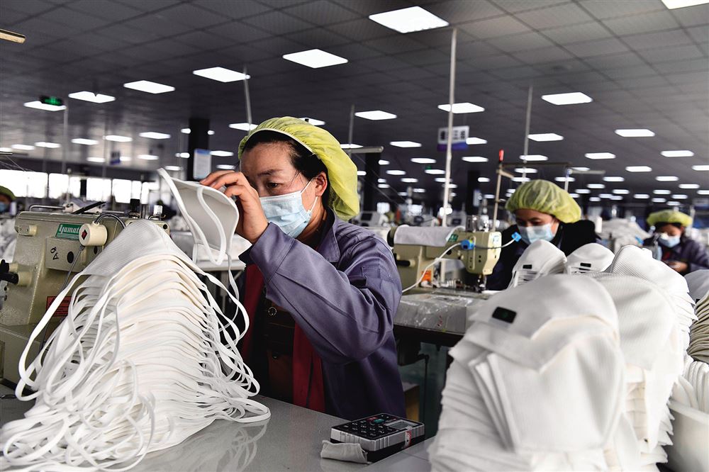 圖為在山東省巨野縣一家針織企業(yè),工人們生產(chǎn)出口的口罩。