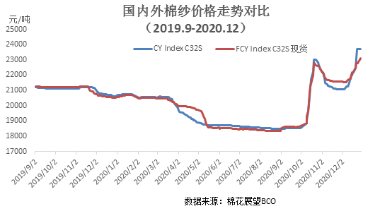 本月內(nèi)外棉紗價格出現(xiàn)連續(xù)上漲行情,國產(chǎn)32支純棉紗12月均價22274元/噸,較上月上漲931元,較去年同期上漲1528元,漲幅7.26%;進口32支純棉紗月均價22218元/噸,較上月上漲524元,較去年同期上漲1699元,較去年同期上漲1528元,漲幅7.86%。