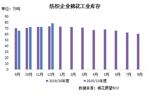 本月棉價繼續(xù)上漲,但下游需求旺盛,部分紡企開始補充原料庫存。截至12月31日紡企在庫棉花工業(yè)庫存量80.23噸,較上月底上升7.46萬噸,同比增加6.98萬噸。其中19%企業(yè)減少棉花庫存,38%增加庫存,43%基本保持不變。