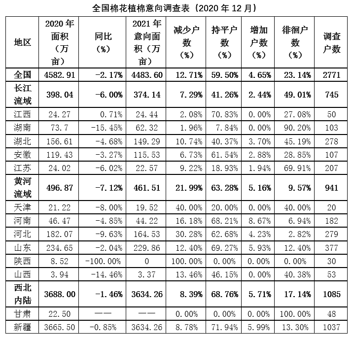 2020年12月,中國棉花協(xié)會對全國13個省市和新疆生產(chǎn)建設(shè)兵團共2771個定點農(nóng)戶進行2021年首次植棉意向調(diào)查。調(diào)查結(jié)果顯示:全國植棉意向面積為4483.60萬畝,同比減少2.17%,其中新疆棉農(nóng)植棉意向減少0.85%,黃河流域和長江流域意向分別減少7.12%和6.00%。意向下降的主要原因是各棉區(qū)2020年的棉花補貼尚未落實及來年補貼政策不明朗,導(dǎo)致棉農(nóng)植棉積極性不高。內(nèi)地2020年棉花減產(chǎn)幅度較大,特別是長江流域,棉花受災(zāi)較重,總體收益不高,近3成監(jiān)測戶植棉意向不明,仍在徘徊觀望。