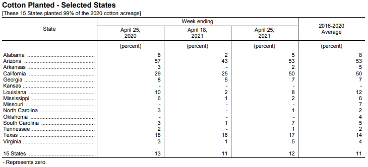 美國(guó)農(nóng)業(yè)部4月26日發(fā)布的美國(guó)棉花生長(zhǎng)報(bào)告顯示,截至4月25日當(dāng)周,美棉種植率為12%,前周為11%,去年同期為13%,5年均值為11%。