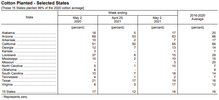 美國農(nóng)業(yè)部5月3日發(fā)布的美國棉花生長報告顯示,截至5月2日當周,美棉種植率為16%,前周為12%,去年同期為17%,5年均值為16%。