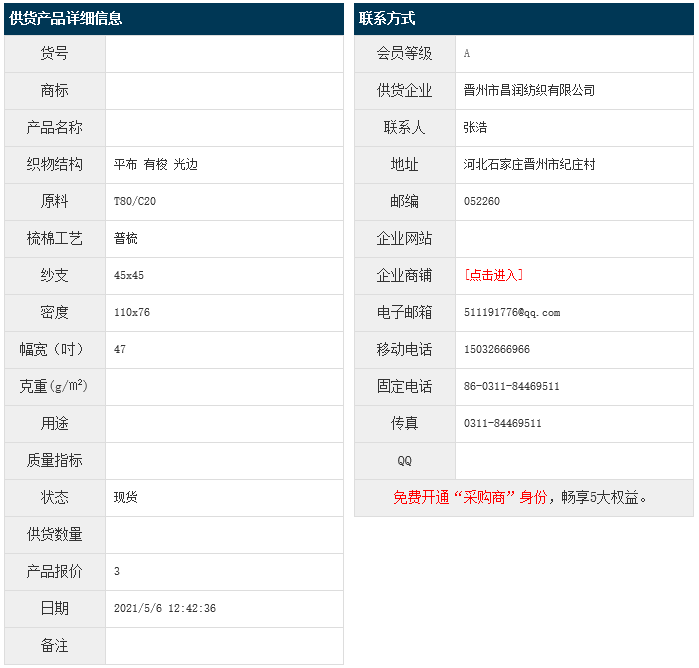 5月6日,晉州昌潤紡織有限公司滌棉平布T80/C20 45x45 110x76 47" 有梭 光邊,報價為3元/米,實際成交價以協(xié)商為準(zhǔn)。[點擊查看詳情]