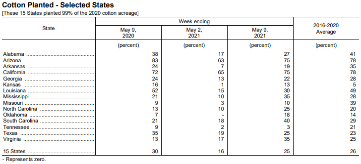 美國(guó)農(nóng)業(yè)部5月10日發(fā)布的美國(guó)棉花生長(zhǎng)報(bào)告顯示,截至5月9日當(dāng)周,美棉種植率為25%,前周為16%,去年同期為30%,5年均值為26%。