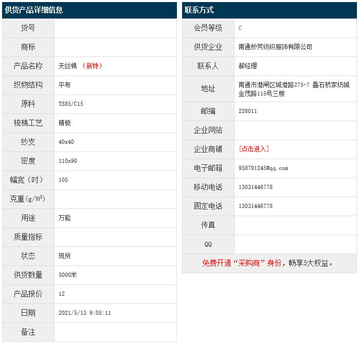 5月13日,南通妙芳紡織服飾有限公司天絲棉平布TS85/JC15 40x40 110x90 105",報(bào)價(jià)為12元/米,實(shí)際成交價(jià)以協(xié)商為準(zhǔn)。[點(diǎn)擊查看詳情]
