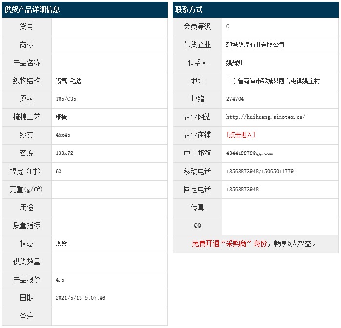 5月13日,鄆城輝煌布業(yè)有限公司滌棉布T65/JC35 45x45 133x72 63" 噴氣 毛邊,報價為4.5元/米,實際成交價以協(xié)商為準。[點擊查看詳情]