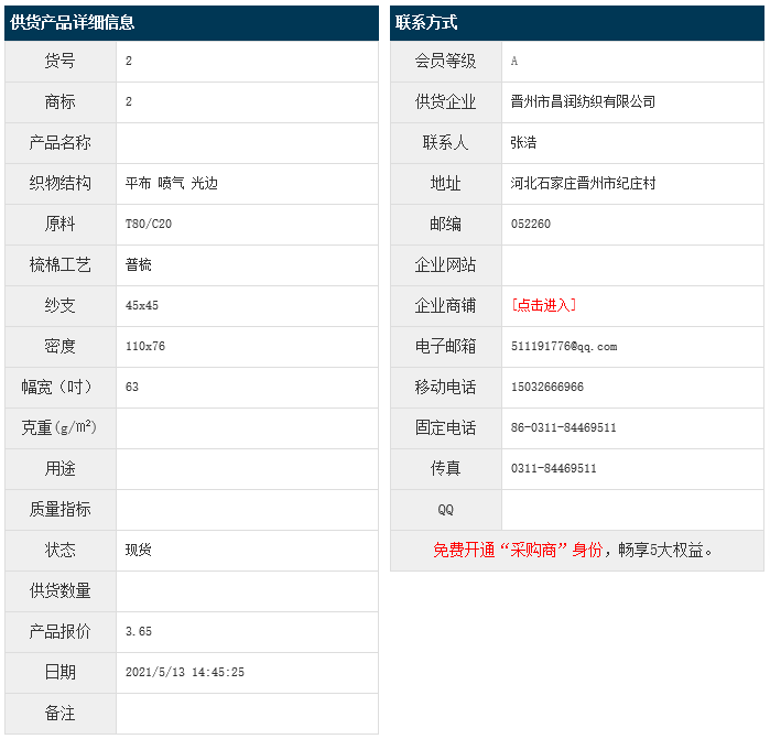 5月13日,晉州昌潤(rùn)紡織有限公司滌棉平布T80/C20 45x45 110x76 63" 噴氣 光邊,報(bào)價(jià)為3.65元/米,實(shí)際成交價(jià)以協(xié)商為準(zhǔn)。[點(diǎn)擊查看詳情]