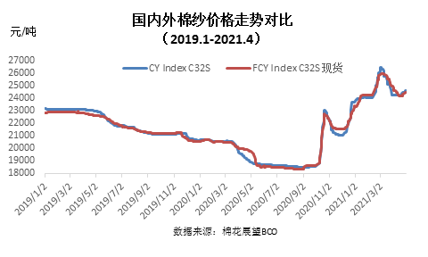 本月內(nèi)外棉紗價(jià)格下跌,國(guó)產(chǎn)32支純棉紗4月均價(jià)為24347元/噸,較上月下跌1167元,跌幅4.57%,較去年同期上漲5060元,漲幅26.2%;進(jìn)口32支純棉紗月均價(jià)為24392元/噸,較上月下跌1214元,跌幅4.74%,較去年同期上漲4488元,漲幅22.5%。