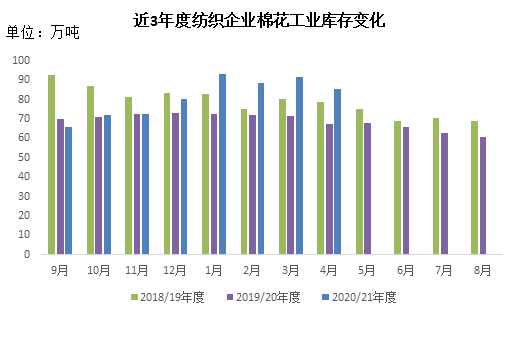 本月棉花價(jià)格上漲,紡織企業(yè)補(bǔ)庫(kù)不多,原料庫(kù)存小幅下降。截至4月30日,紡織企業(yè)在庫(kù)棉花工業(yè)庫(kù)存量為85.63萬(wàn)噸,較上月底下降6.12萬(wàn)噸,同比增加18.29萬(wàn)噸。其中:36%企業(yè)減少棉花庫(kù)存,18%增加庫(kù)存,46%基本保持不變。