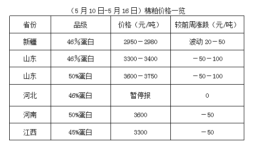 豆粕期貨先行上漲,后大幅下跌,基本回吐五一節(jié)后上漲幅度。周末沿海地區(qū)43%蛋白豆粕價至3400-3620元/噸一線,先漲后跌,較前周下跌50-130元/噸。豆粕期貨、現(xiàn)貨回落,拖累棉粕市場。當前棉粕與豆粕相比無性價比優(yōu)勢,或限制棉粕行情。但因棉籽價格沖高,成本難下,油棉廠經(jīng)營盈利不佳,棉粕供應有限,加之下游養(yǎng)殖業(yè)逐步恢復,水產(chǎn)需料全面啟動,市場需求尚可,或限制棉粕下跌幅度。未來參照豆粕行情走勢,棉粕或結(jié)合自身供求,保持偏強格局調(diào)整運行。