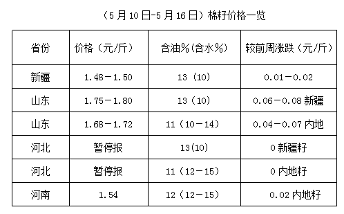 上周(5月10-16日),國內(nèi)豆油、豆粕期貨沖高調(diào)整,豆油表現(xiàn)強于豆粕,棉油高位上沖波動,棉粕沖高回落,市場難以穩(wěn)定。棉籽成交活躍,價格再度走高,內(nèi)地油棉廠到廠高價至1.80元/斤,但當前油棉廠經(jīng)營利潤仍不理想,個別油棉廠收購謹慎,無奈棉籽貨少優(yōu)勢明顯,市場雖有小幅調(diào)整,但高位波動運行持續(xù)。