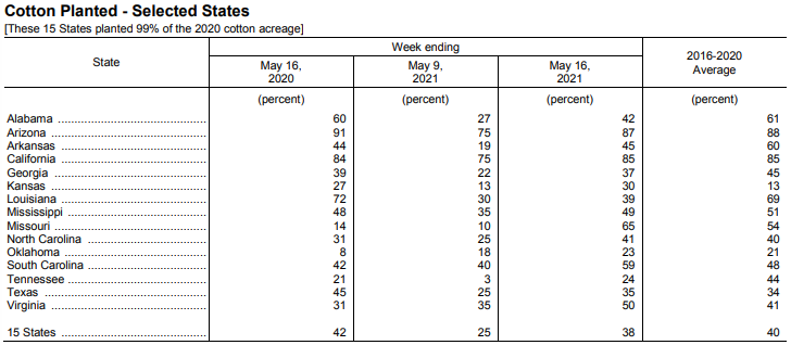 美國農(nóng)業(yè)部5月17日發(fā)布的美國棉花生長報告顯示,截至5月16日當(dāng)周,美棉種植率為38%,前周為25%,去年同期為42%,5年均值為40%。